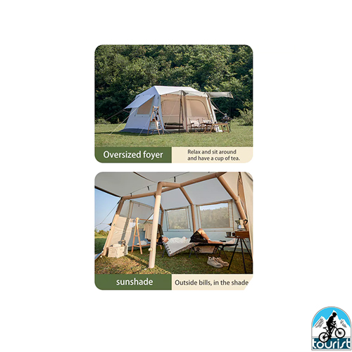 لایه بیرونی (پوشش ضدآب): بر روی این لایه، پوشش بیرونی از پلیاستر اکسفورد 150D قرار میگیرد. این پوسته محافظ، با شاخص مقاومت در برابر آب 2000 تا 4000 میلیمتر، شما را در برابر شدیدترین بارانها و طوفانها کاملاً خشک و ایمن نگه میدارد. این ساختار دولایه، یک فضای هوای عایق در میان خود ایجاد کرده که در تابستان از ورود گرما و در فصول سرد از خروج آن جلوگیری میکند. با ارتفاع 195 سانتیمتر و فضای 8.5 متر مربعی، این یک خانه کامل برای زندگی کردن در دل طبیعت است.